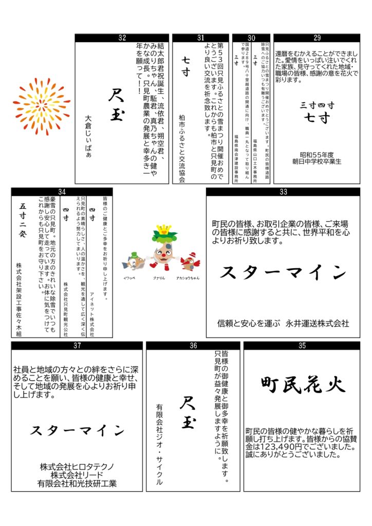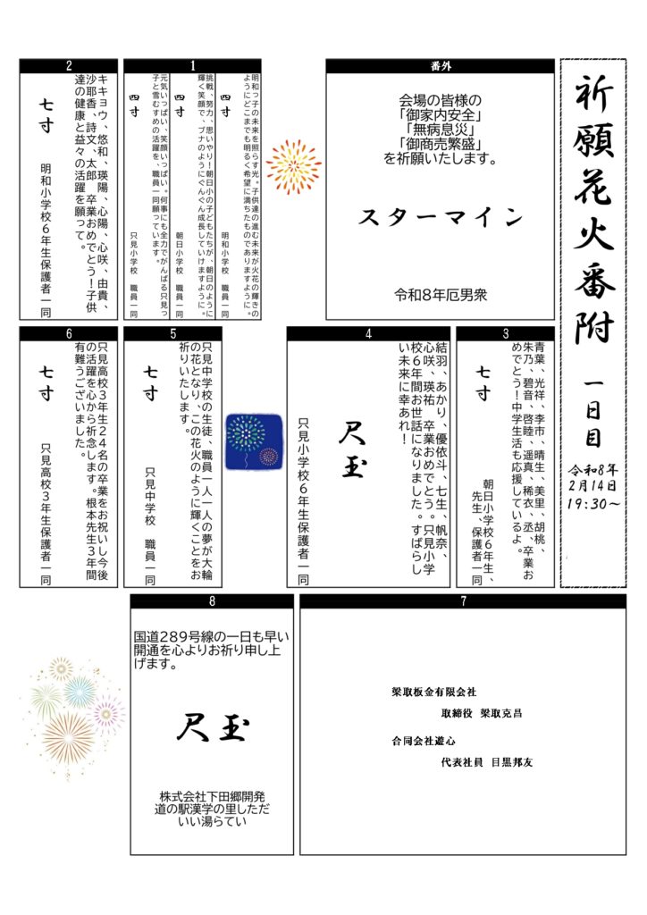 第53回只見ふるさとの雪まつり(14日、15日)の祈願花火番附はこちら。